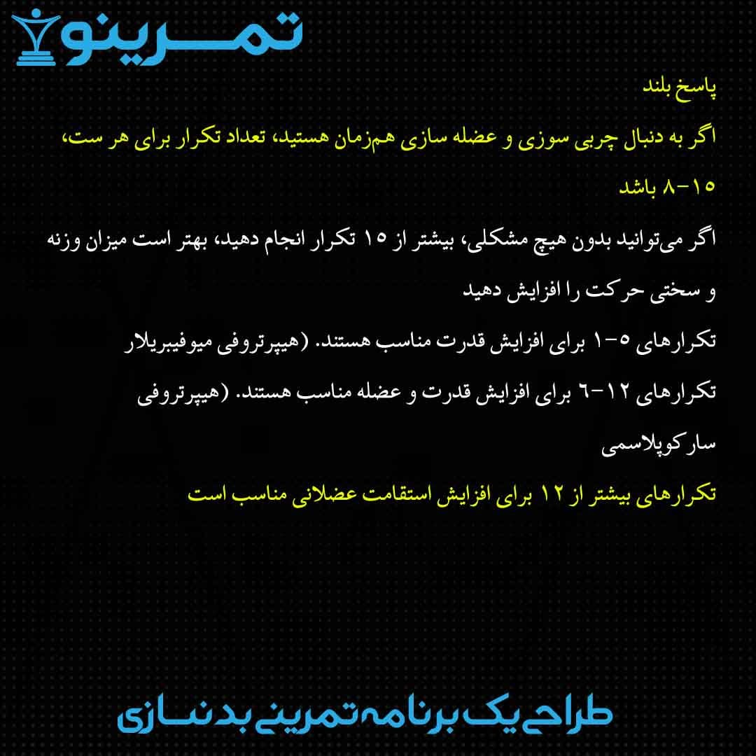- اگر به دنبال چربی سوزی و عضله سازی همزمان هستید، تعداد تکرار برای هر ست، ۸-۱۵ باشد.