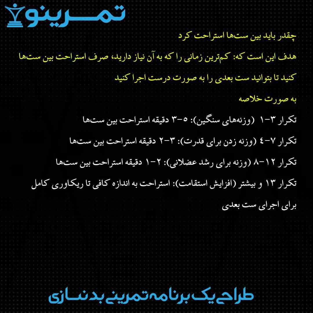 هدف این است که: کمترین زمانی را که به آن نیاز دارید، صرف استراحت بین ستها کنید تا بتوانید ست بعدی را به صورت درست اجرا کنید. منبع (۲)