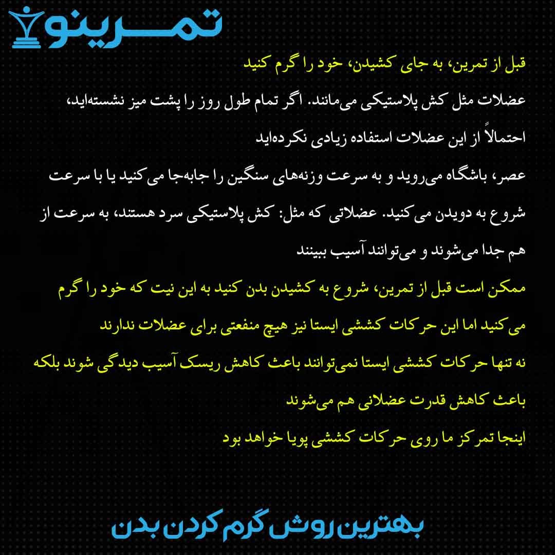 نکته مهم این است که: حرکات کششی را در این زمان با دقت و کنترل کامل روی عضلات انجام بدهیم.