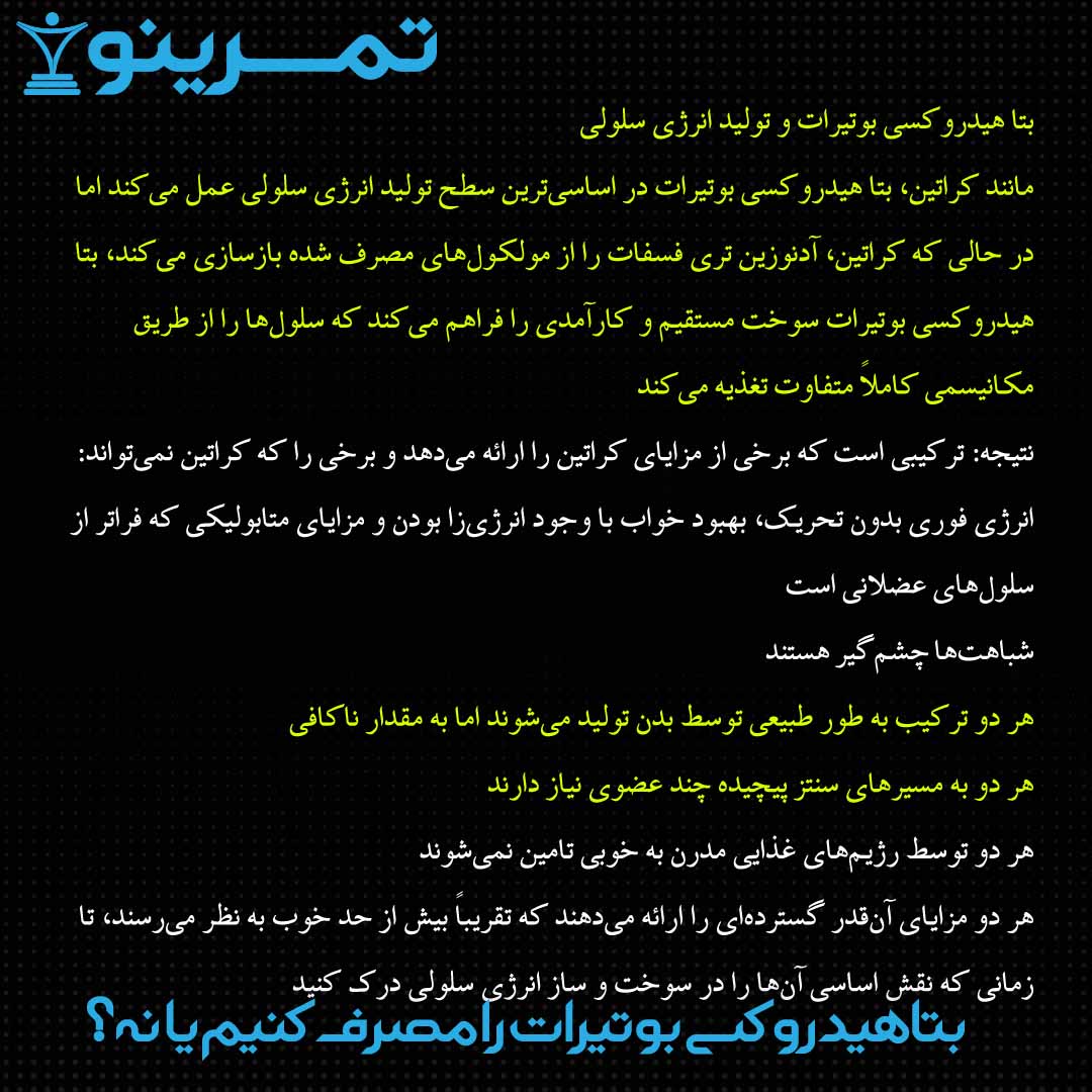 مانند کراتین، بتا هیدروکسی بوتیرات (BHB) در اساسی‌ترین سطح تولید انرژی سلولی عمل می‌کند اما در حالی که کراتین، آدنوزین تری فسفات ATP را از مولکول‌های مصرف شده بازسازی می‌کند، BHB سوخت مستقیم و کارآمدی را فراهم می‌کند که سلول‌ها را از طریق مکانیسمی کاملاً متفاوت تغذیه می‌کند.