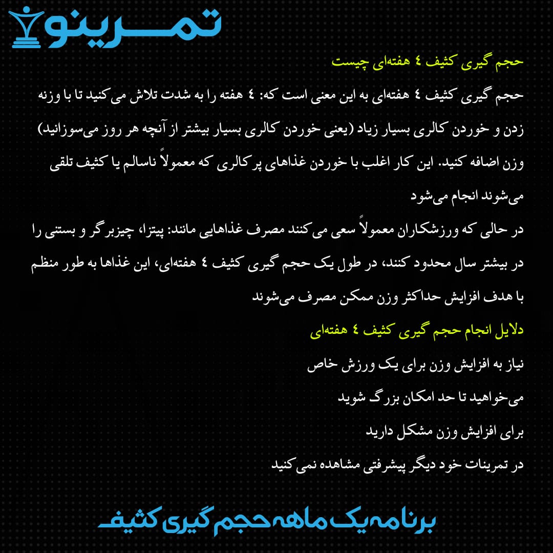 حجم گیری کثیف ۴ هفتهای به این معنی است که: ۴ هفته را به شدت تلاش میکنید تا با وزنه زدن و خوردن کالری بسیار زیاد (یعنی خوردن کالری بسیار بیشتر از آنچه هر روز میسوزانید) وزن اضافه کنید. این کار اغلب با خوردن غذاهای پرکالری که معمولاً ناسالم یا کثیف تلقی میشوند انجام میشود.