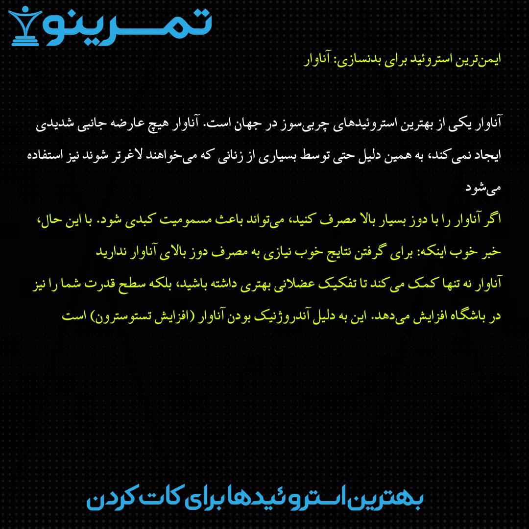 آناوار یکی از بهترین استروئیدهای چربیسوز در جهان است. آناوار هیچ عارضه جانبی شدیدی ایجاد نمیکند، به همین دلیل حتی توسط بسیاری از زنانی که میخواهند لاغرتر شوند نیز استفاده میشود.