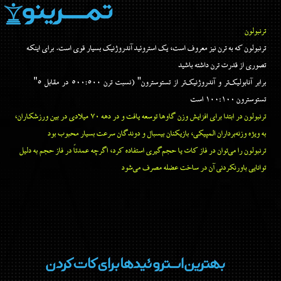 “۵ برابر آنابولیکتر و آندروژنیکتر از تستوسترون” (نسبت ترن ۵۰۰:۵۰۰ در مقابل تستوسترون ۱۰۰:۱۰۰ است).