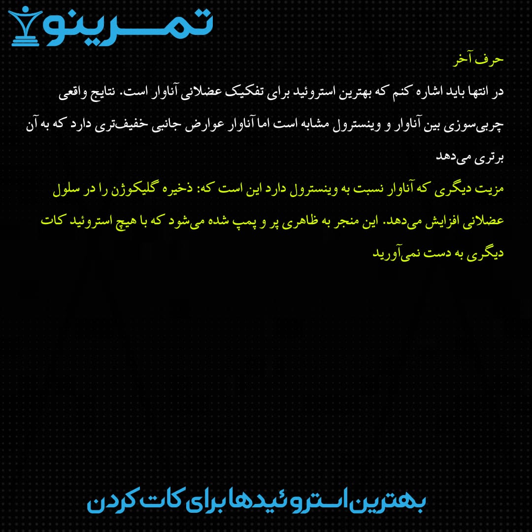 در انتها باید اشاره کنم که بهترین استروئید برای تفکیک عضلانی آناوار است. نتایج واقعی چربیسوزی بین آناوار و وینسترول مشابه است اما آناوار عوارض جانبی خفیفتری دارد که به آن برتری میدهد.