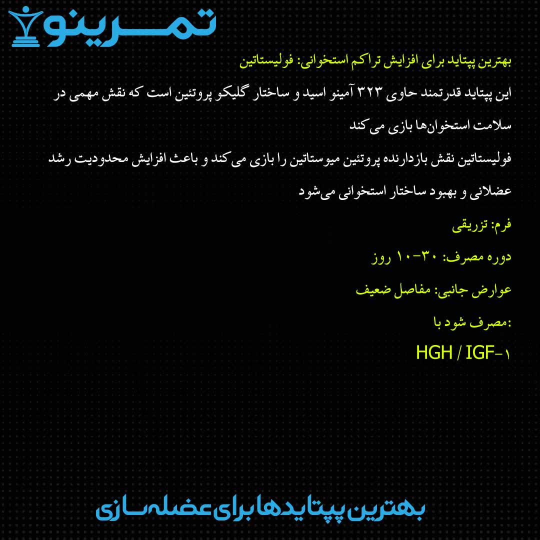 پپتایدهایی مثل: فولیستاتین ۳۴۴ جلوی پروتئین میوستاتین را می‌گیرند که مسئول محدود کردن رشد عضلانی است. منبع (۱۳)
