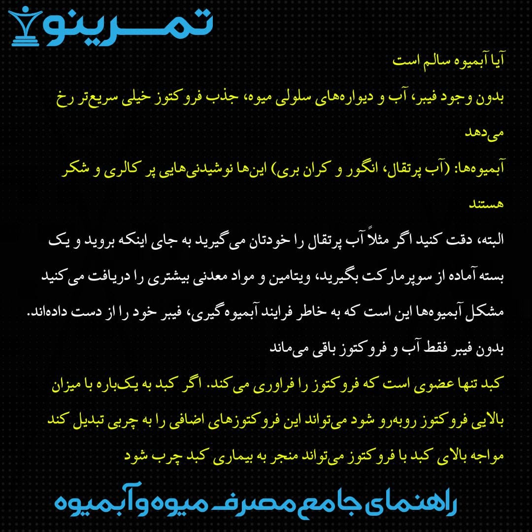 مشکل آبمیوهها این است که به خاطر فرایند آبمیوهگیری، فیبر خود را از دست دادهاند. بدون فیبر فقط آب و فروکتوز باقی میماند.