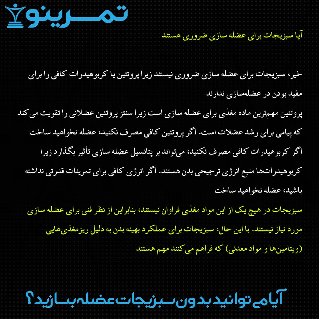 سبزیجات در هیچ یک از این مواد مغذی فراوان نیستند، بنابراین از نظر فنی برای عضله سازی مورد نیاز نیستند. با این حال، سبزیجات برای عملکرد بهینه بدن به دلیل ریزمغذیهایی (ویتامینها و مواد معدنی) که فراهم میکنند مهم هستند. منبع (۲)