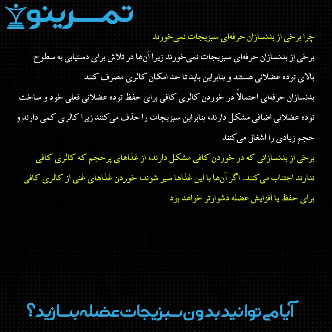 بدنسازان حرفهای احتمالاً در خوردن کالری کافی برای حفظ توده عضلانی فعلی خود و ساخت توده عضلانی اضافی مشکل دارند، بنابراین سبزیجات را حذف میکنند زیرا کالری کمی دارند و حجم زیادی را اشغال میکنند.