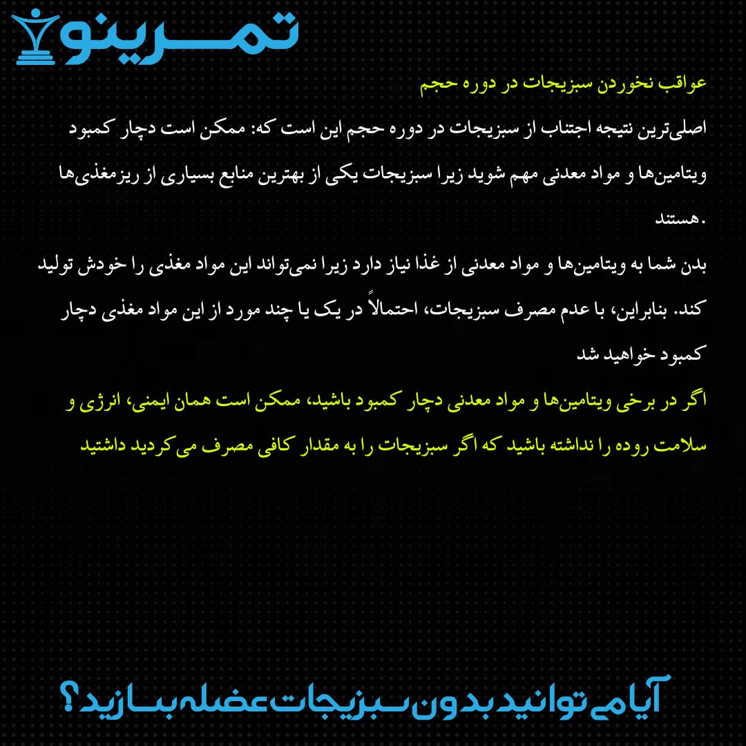 اصلیترین نتیجه اجتناب از سبزیجات در دوره حجم این است که: ممکن است دچار کمبود ویتامینها و مواد معدنی مهم شوید زیرا سبزیجات یکی از بهترین منابع بسیاری از ریزمغذیها هستند.
