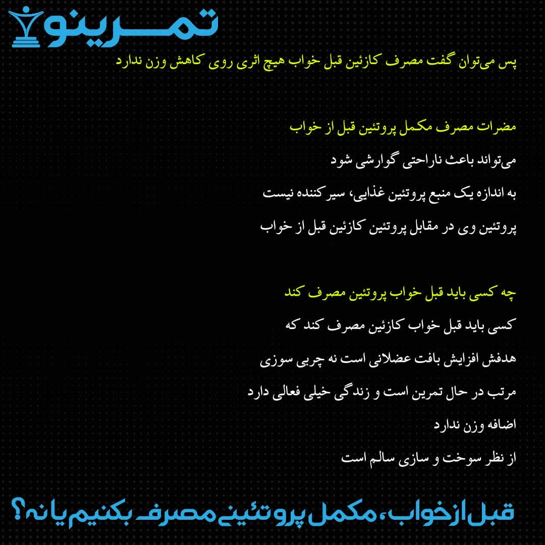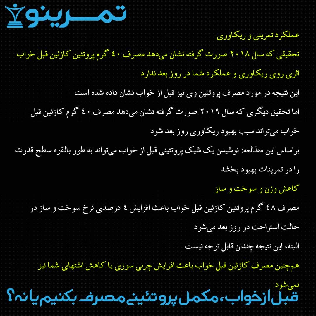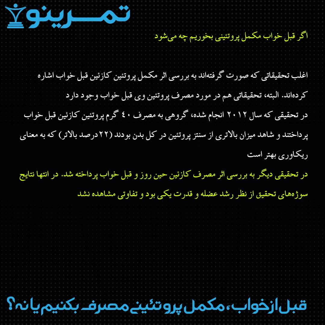 تحقیقی که سال ۲۰۱۸ صورت گرفته نشان میدهد مصرف ۴۰ گرم پروتئین کازئین قبل خواب اثری روی ریکاوری و عملکرد شما در روز بعد ندارد! منبع (۵)