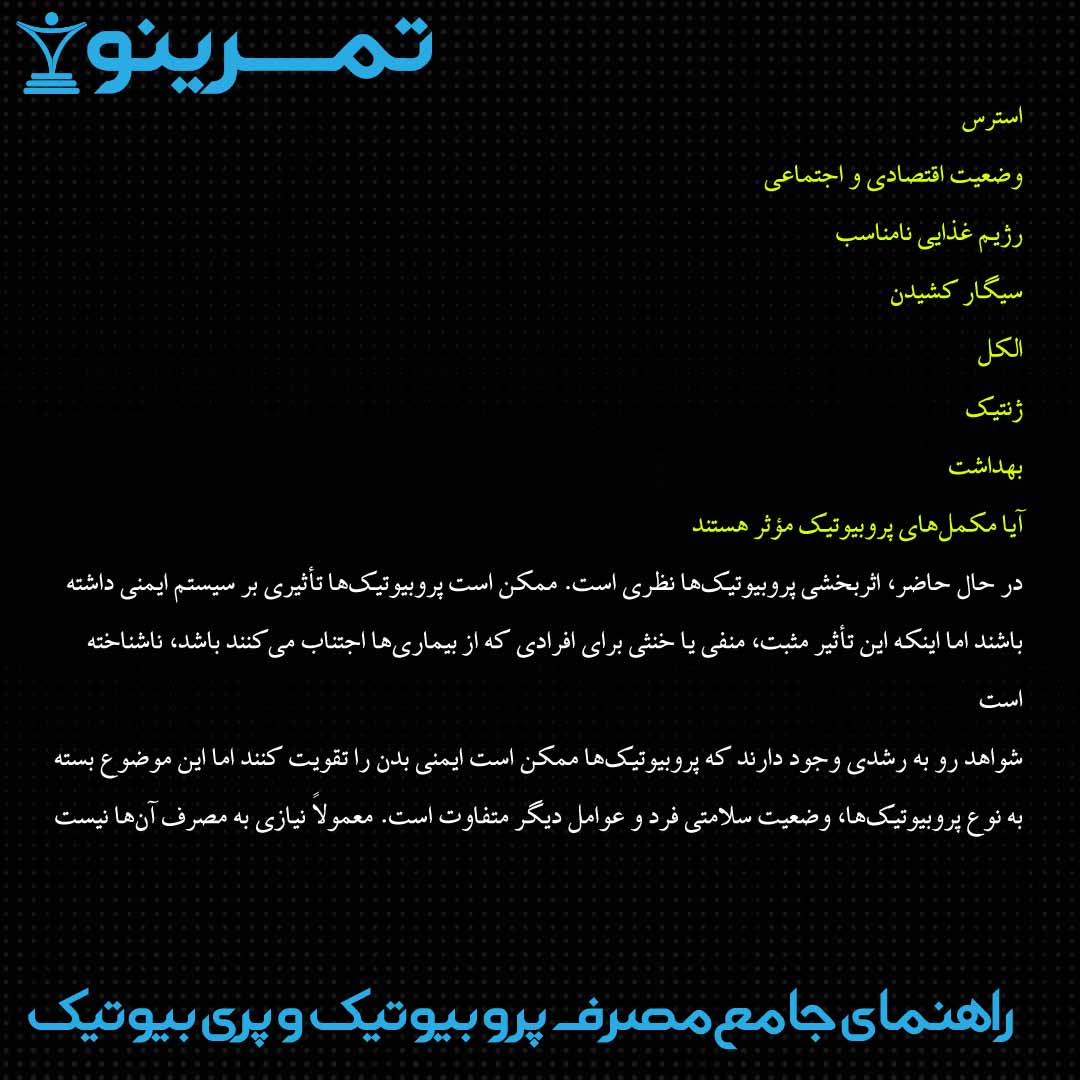 اگر شخصی سالم باشد، یعنی کسی که اساساً هیچ مشکل سلامتی ندارد، نیازی به مصرف مکمل پروبیوتیک ندارد. هیچ مدرکی وجود ندارد که نشان دهد: مصرف آن سلامت شما را بهبود میبخشد. اگر اخیراً کمی ناسالم بودهاید، پروبیوتیکها نمیتوانند این خلأها را پر کنند.