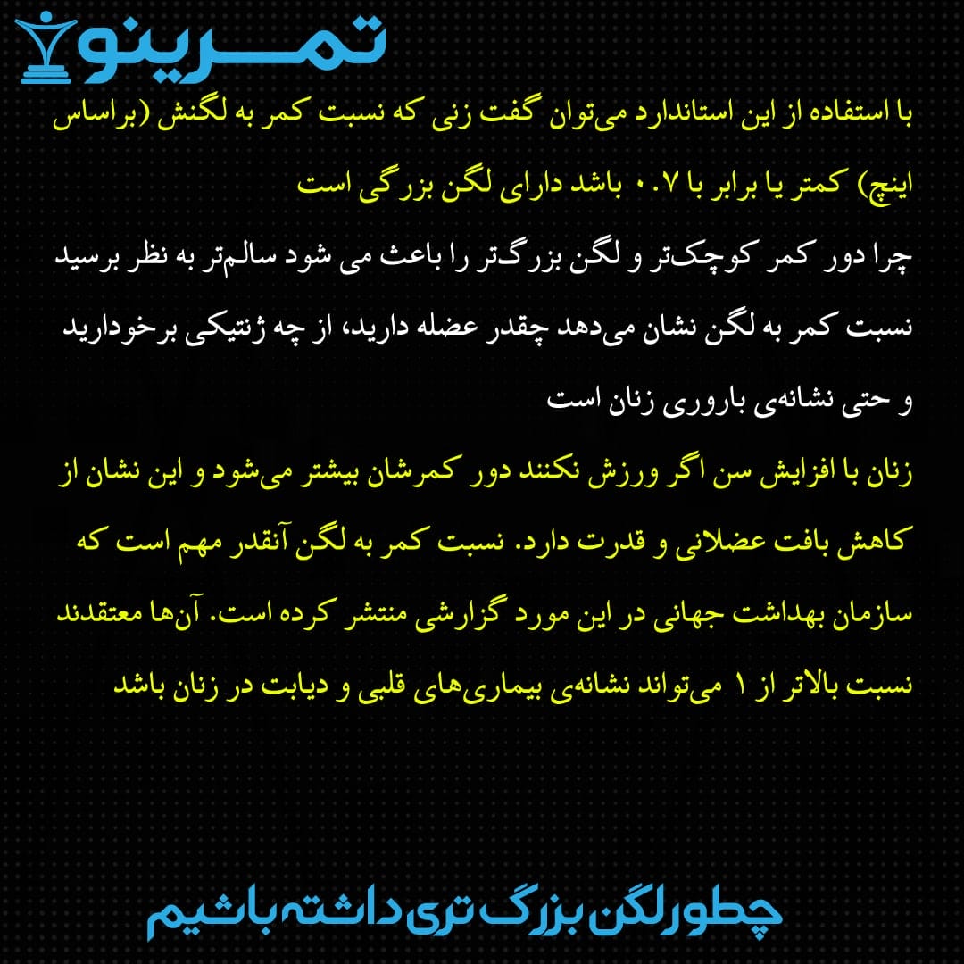 زنان با افزایش سن اگر ورزش نکنند دور کمرشان بیشتر میشود و این نشان از کاهش بافت عضلانی و قدرت دارد. نسبت کمر به لگن آنقدر مهم است که سازمان بهداشت جهانی (WHO) در این مورد گزارشی منتشر کرده است. آنها معتقدند نسبت بالاتر از ۱ میتواند نشانهی بیماریهای قلبی و دیابت در زنان باشد. منبع (۲)