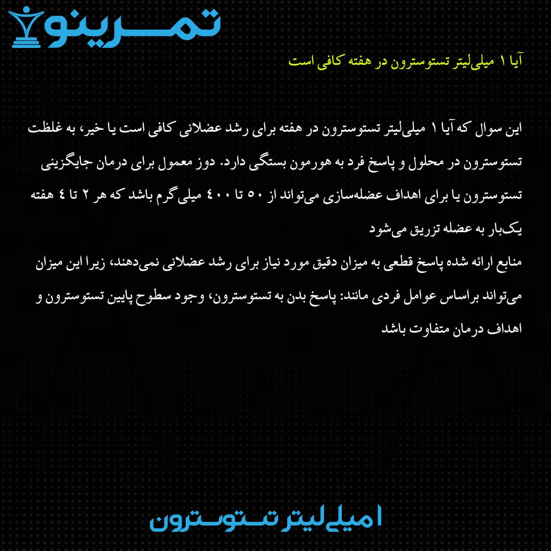این سوال که آیا ۱ میلیلیتر تستوسترون در هفته برای رشد عضلانی کافی است یا خیر، به غلظت تستوسترون در محلول و پاسخ فرد به هورمون بستگی دارد. دوز معمول برای درمان جایگزینی تستوسترون (TRT) یا برای اهداف عضلهسازی میتواند از ۵۰ تا ۴۰۰ میلیگرم باشد که هر ۲ تا ۴ هفته یکبار به عضله تزریق میشود.